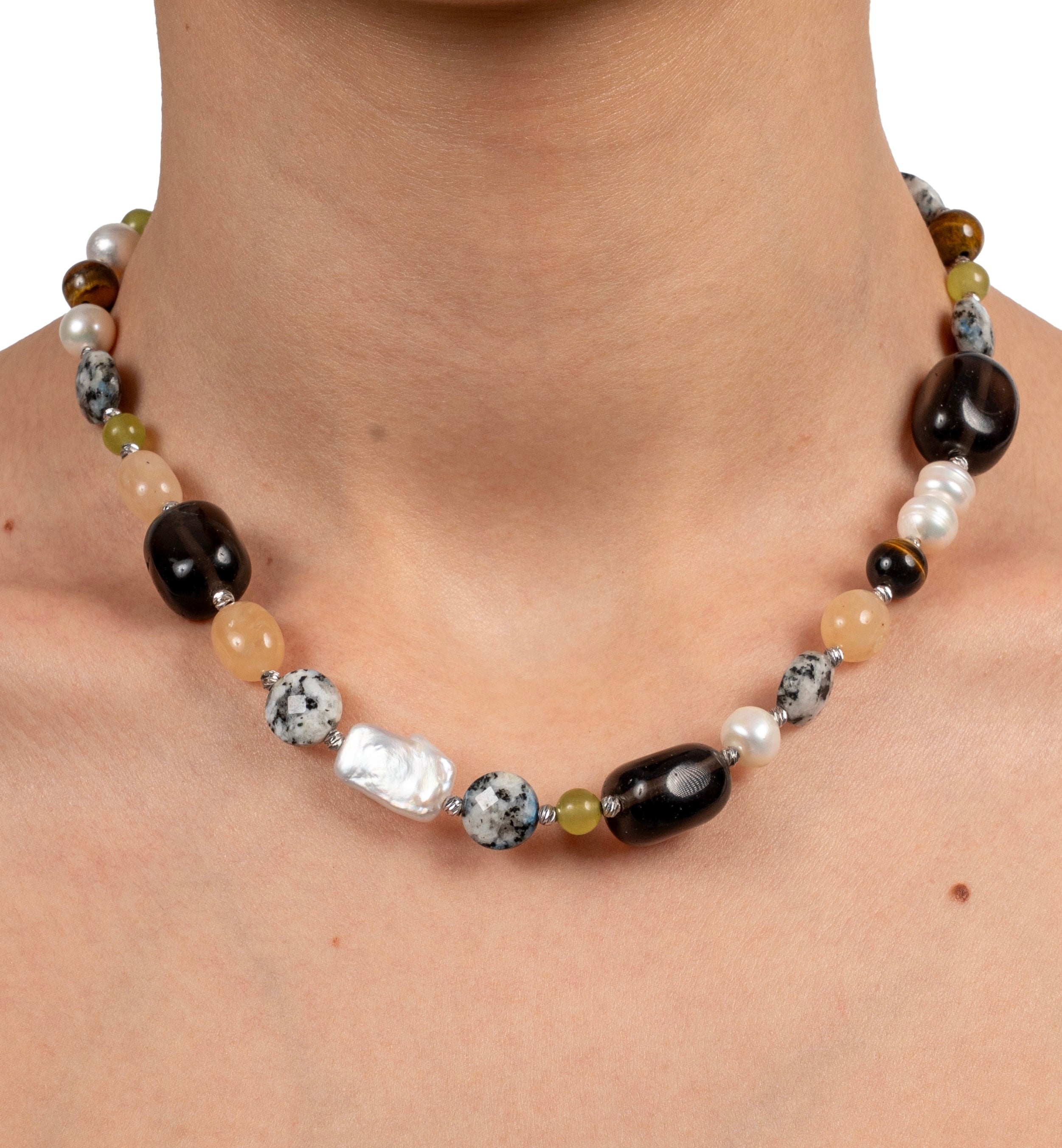 Bu kolyede yer alan dumanlı kuvars, geçmişten gelen yükleri nazikçe serbest bırakmaya yardımcı olurken, zihni sakinleştirir ve kişinin ayaklarını yere bastırır. Hayatın karmaşasında güvenli bir alan yaratır.